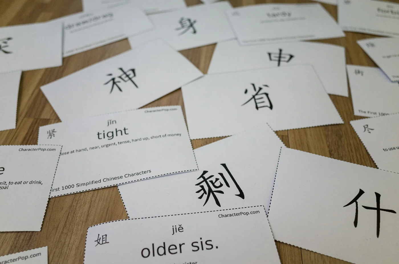 Character is printed on one side, definition and pinyin pronunciation on the other.